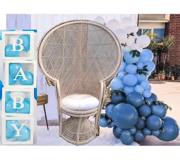 This is a MUST HAVE! for a Baby Shower Celebration. This package includes a lovely and comfortable Peacock Wicker Chair, decorated with a side of balloons arch and green leaves or flowers,  Baby Blocks filled with balloons or a matching Giant Teddy Bear. Oh!, and a Rug for the floor.